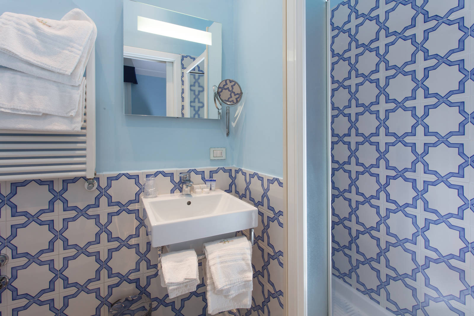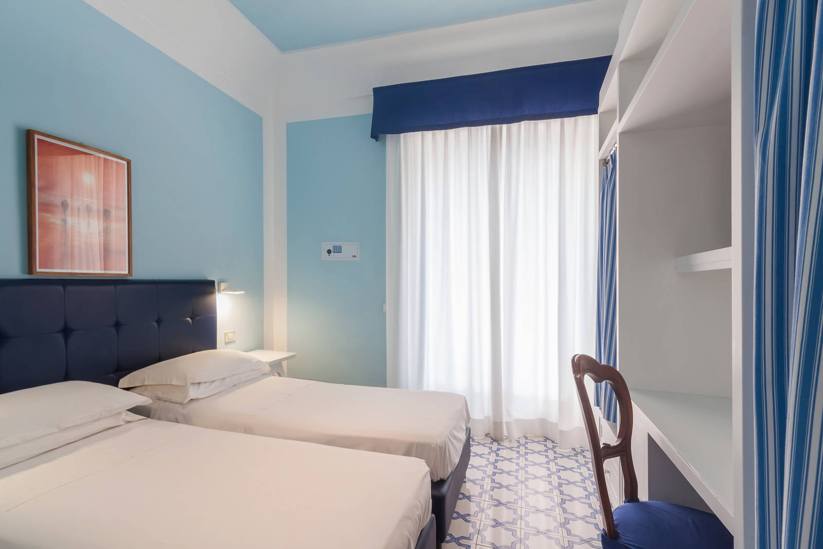 Furnished with hand-painted tiles and finished with white wood furniture and pastel fabrics with a street view balcony.